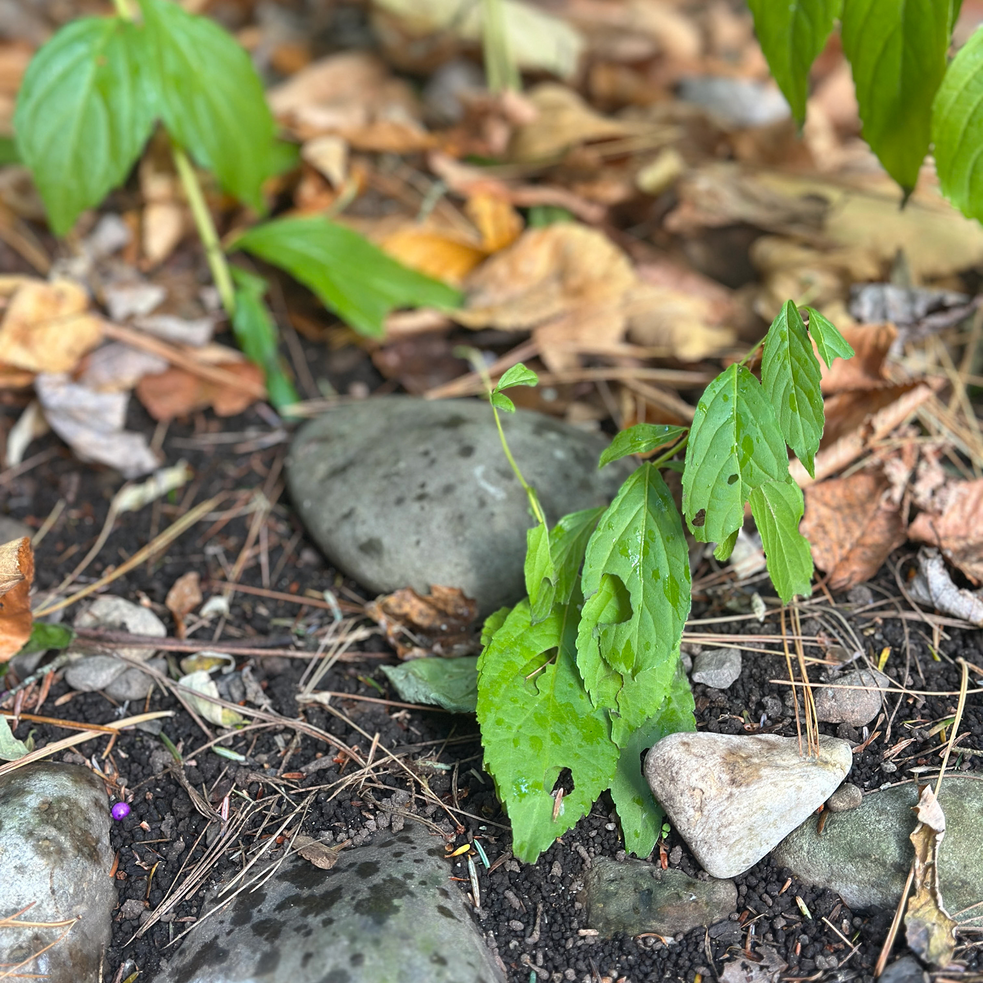 A simple rock hold the branch firmly in place so that roots can form undisturbed.
